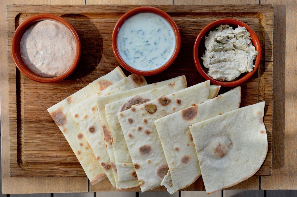 Mixed Meze board – AED 60 – selection of 3 tradition dips with pita bread
