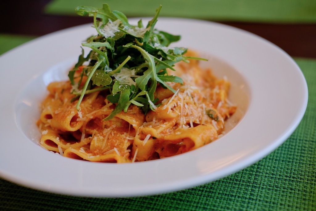 Seafood Pasta – AED 65 – slow cooked prawns, coriander, chilli tomato cream sauce, rocket and parmesan