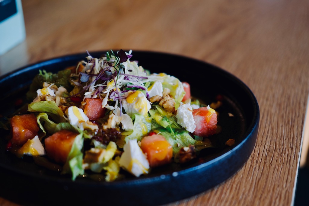 Watermelon feta salad – AED 36 – watermelon cubes, mixed lettuce, feta cheese, roasted walnuts, pomegranate seeds, tossed in balsamic reduction