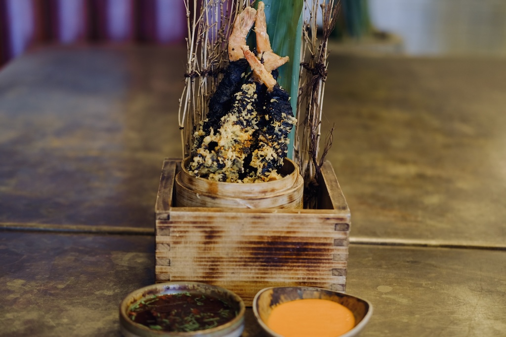 P R AW N T E M P U R A – AED 65 – Prawns / Tentsuyu / White Radish / Ginger / Spring Onion / Gochujang Mayo / Squid Ink Tempura