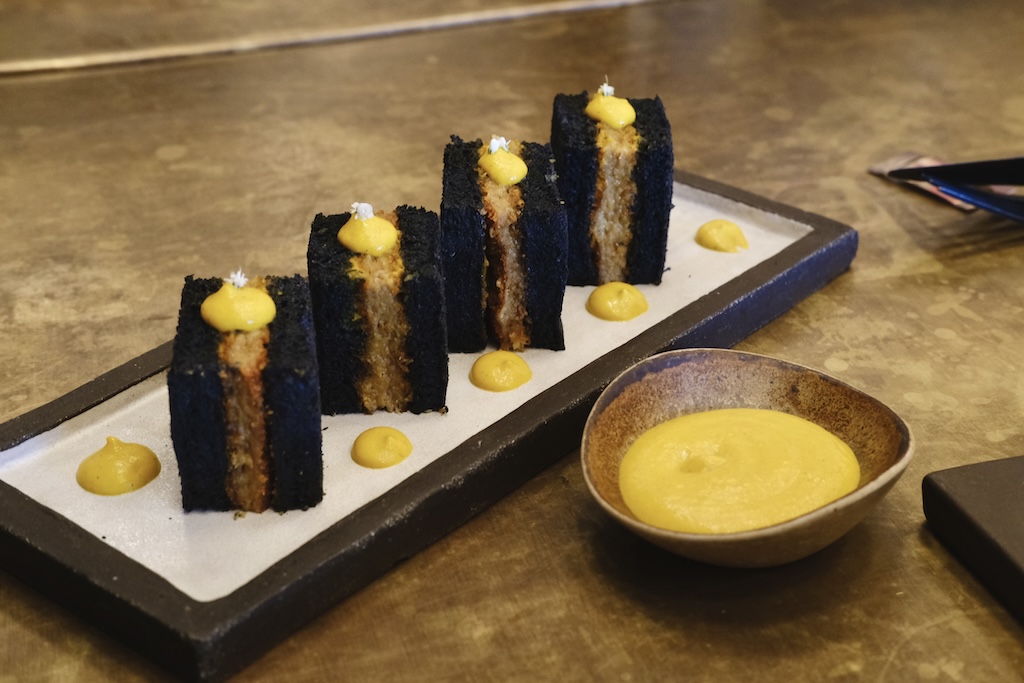 CHICKEN SANDO – Aed 65 – Corn Fed Chicken / Yellow Chilli Sauce / Charcoal bread / Soy Sauce Onion Relish