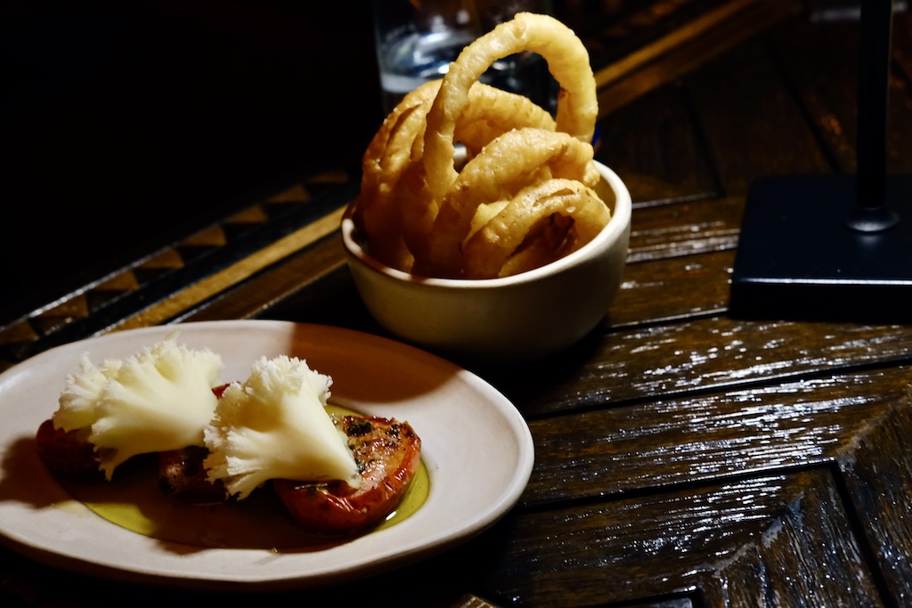 Sides – Semidried tomatoes, oregano, Tete De Moine(AED 65) and Onion rings with sea salt(AED 60)